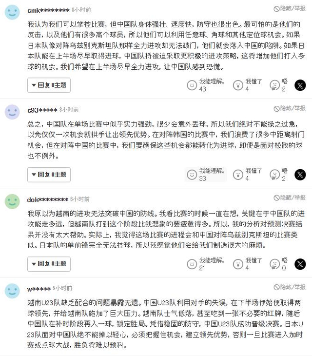 第二个,日本球迷对中国足球的进步也是相当惊讶了。他们说:非常期待与史上最强的中国队进行的决赛。中国队防守稳固,个子高、身材强壮、速度快,还非常有耐心,最可怕的是他们的反击和定位球,日本国内近年来完全低估了这个对手。中国队一旦学会稳固防守,就会变得很强,而且年轻一代已经不喜欢功夫足球了。还有球迷感慨:我看了中国对越南,就防守而言,简直就像看一支完整的日本国家队,如果中国队保持这种信心,未来会成为一支非常强大的对手。